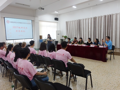 2017级新生代表雷明对学院和老师表达了衷心的感谢,希望大家在求学路上要践行“仁爱精勤”的校训,用自己的力量架起与世界的沟通桥梁。来自美国的新生代表刘熙妍说道,她去过无数个地方,但最让她留念的是还是生活了4年的长沙,在湖南师大的研究生学习生活又将是全新的体验。她希望在这里能进一步提升,感受汉语的美丽,体验博大的中国文化。